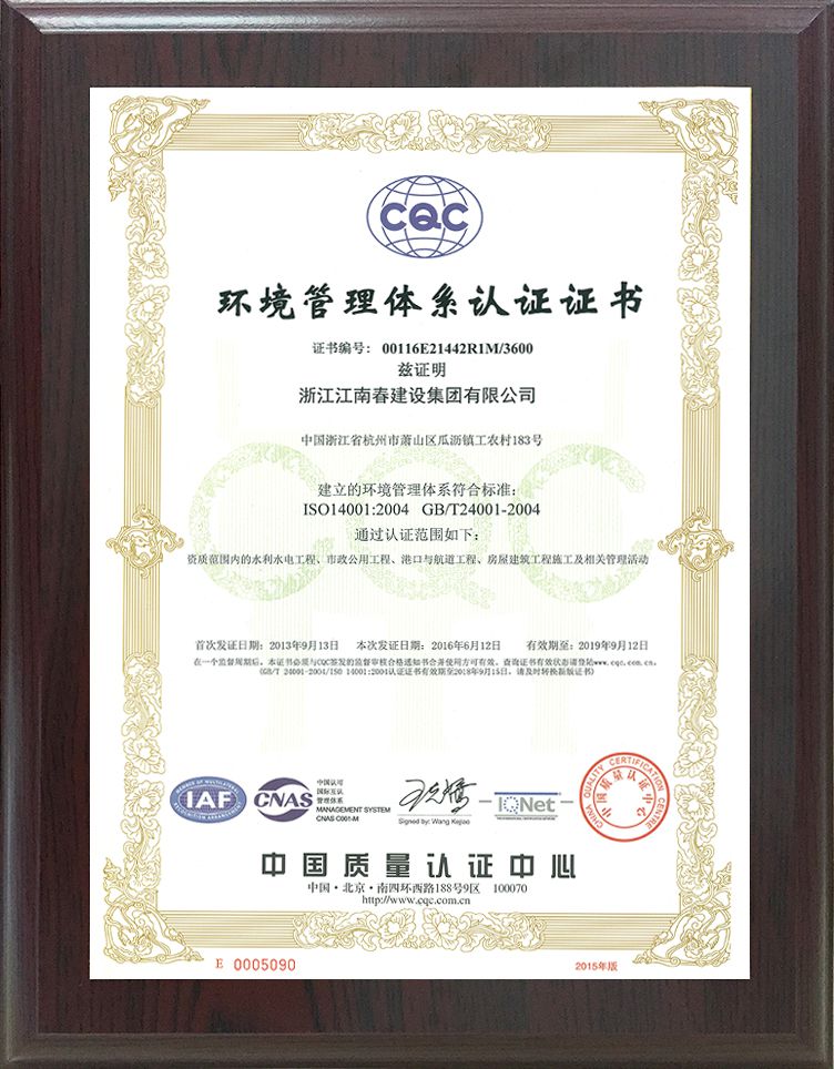 環(huán)境管理體系認證證書