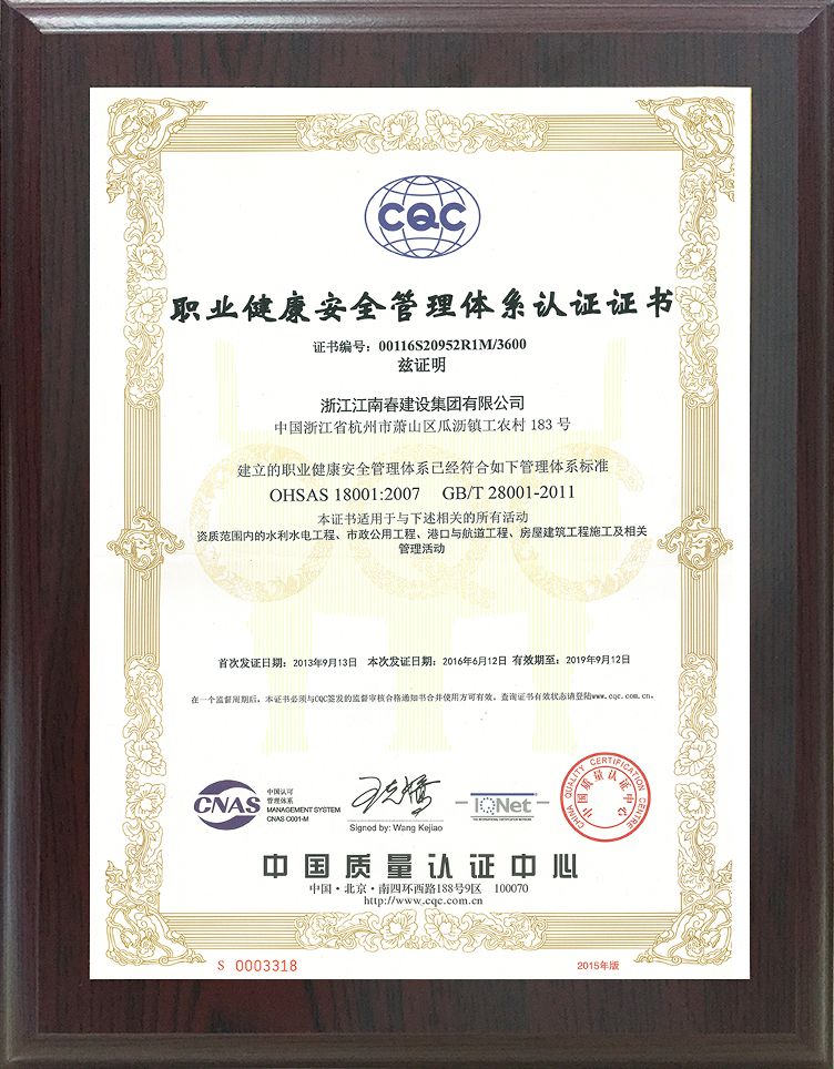 職業(yè)健康安全管理體系認證證書