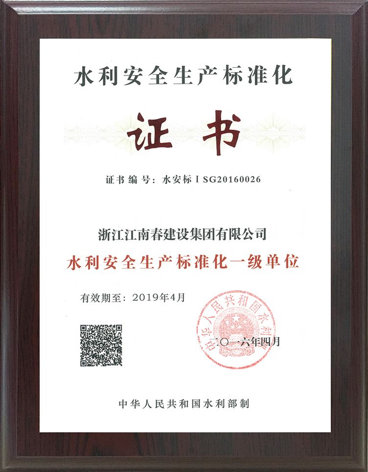 水利安全生產(chǎn)標準化一級單位證書