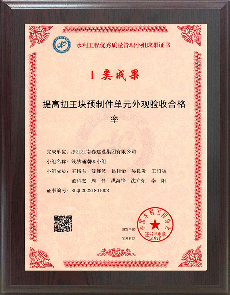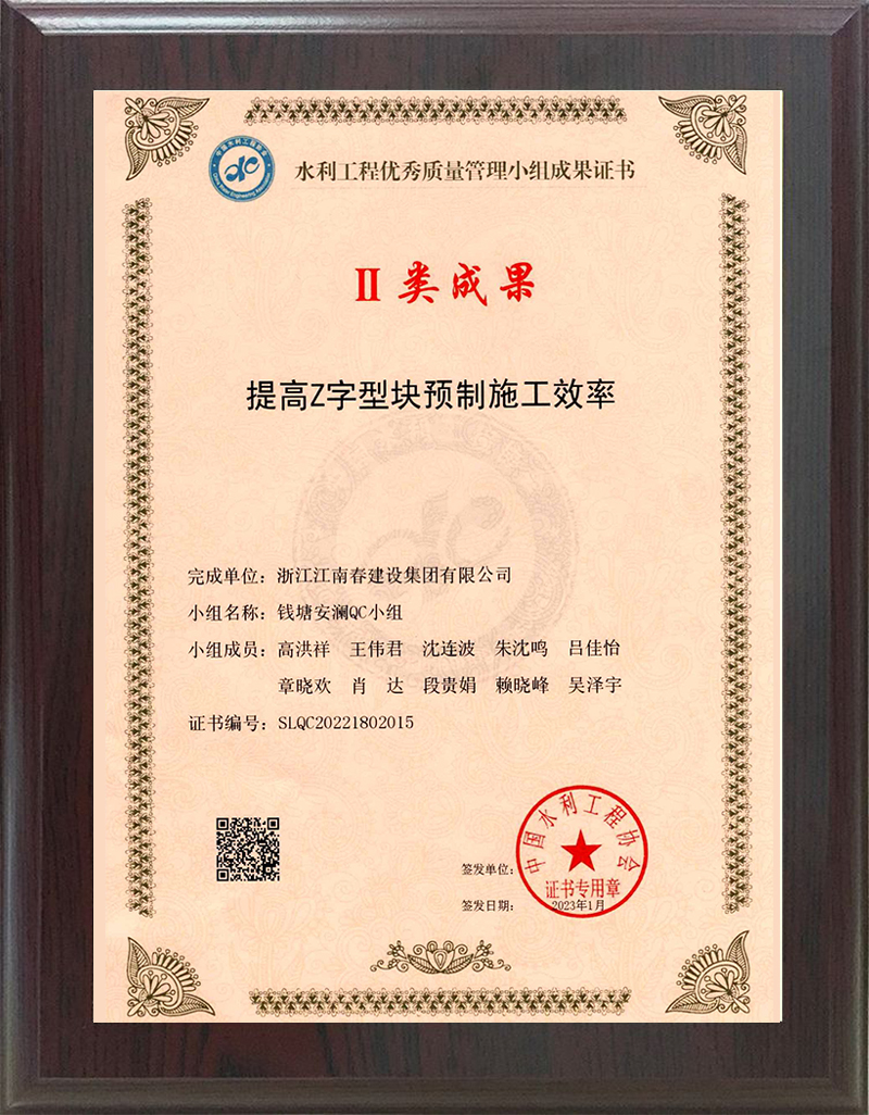 水利工程優(yōu)秀質(zhì)量管理小組成果證書 II類成果(降低防浪墻內(nèi)傾墻身蜂窩麻面發(fā)生率)