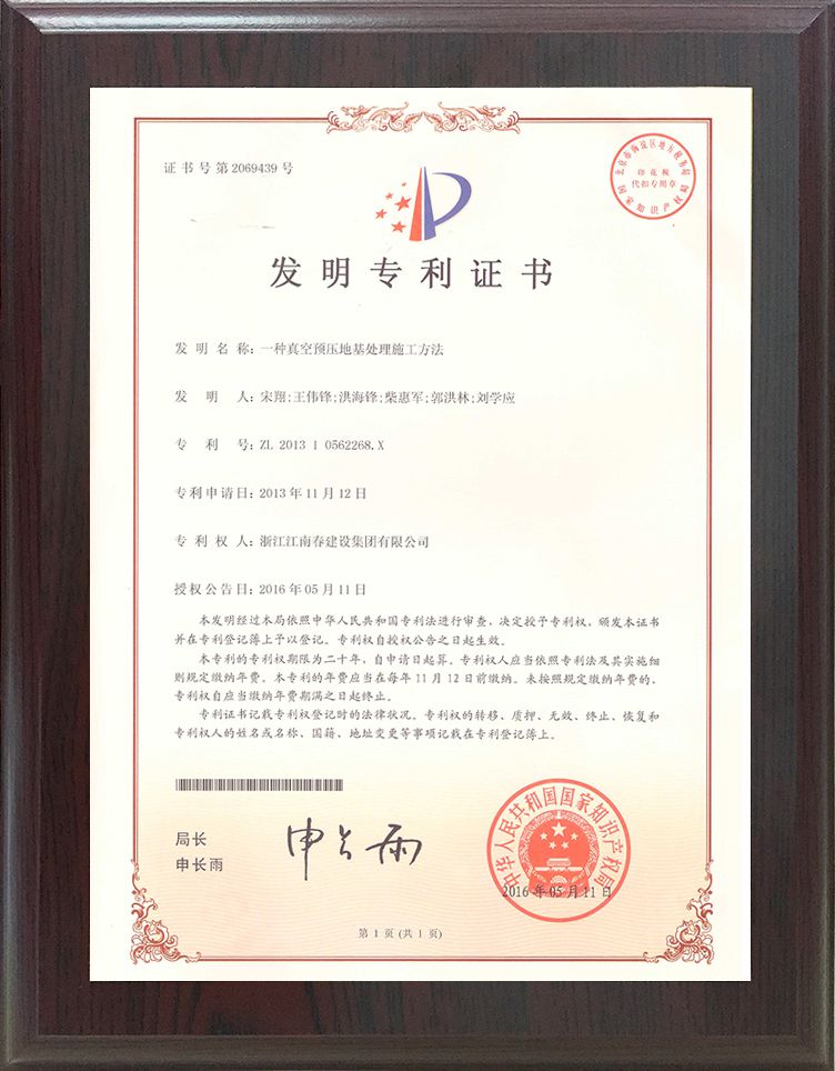 發(fā)明專利證書(一種真空預(yù)圧地基處理施工方法)
