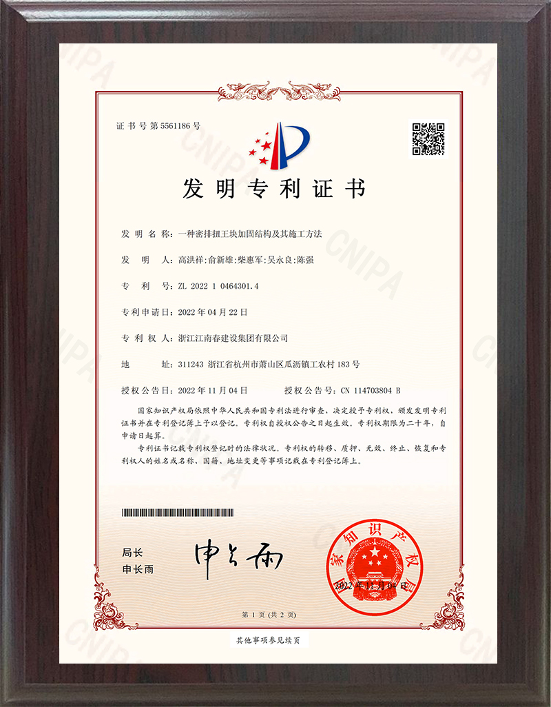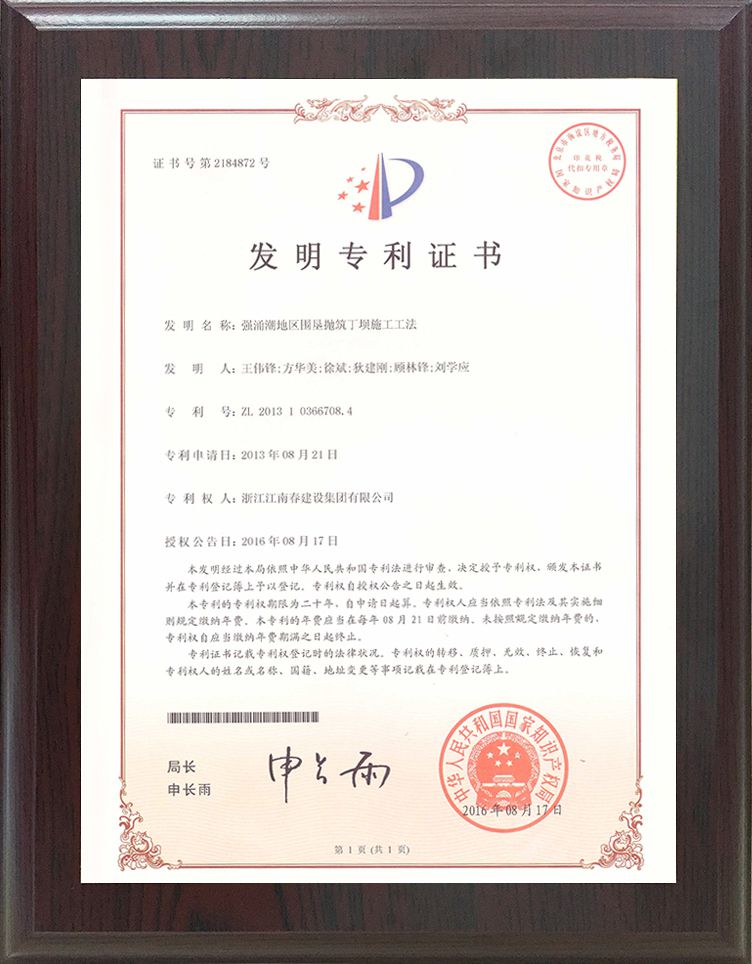 發(fā)明專利證書(強(qiáng)涌潮地區(qū)圍墾拋筑丁壩施工工法)