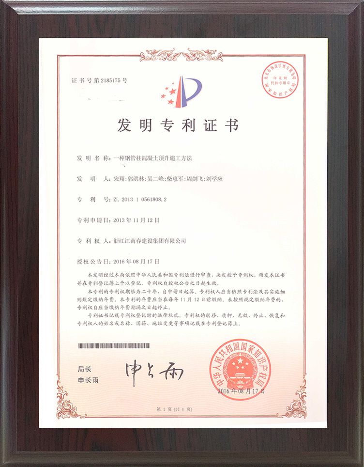 發(fā)明專利證書(一種鋼管柱混凝土頂升施工方法)