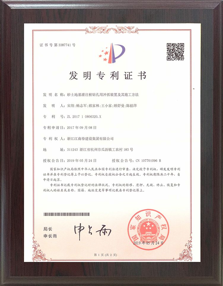 發(fā)明專利證書(砂土地基灌注樁鉆孔用沖抓裝置及其施工方法)
