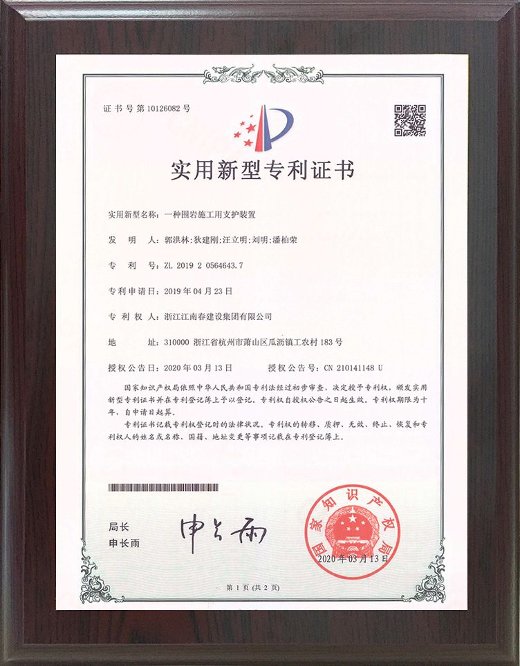 實(shí)用新型專利證書( 一種圍巖施工用支護(hù)裝置)