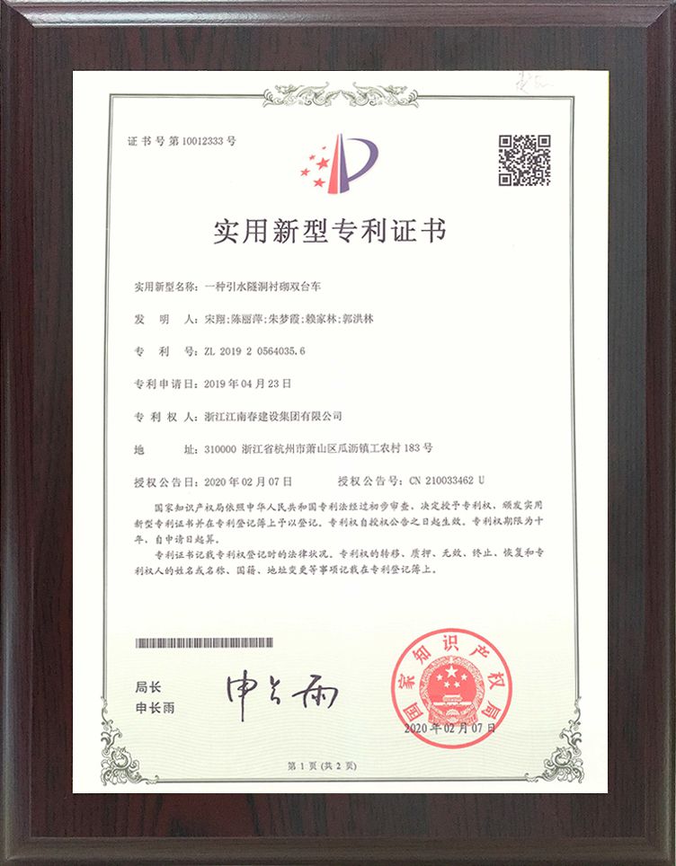 實(shí)用新型專利證書( 一種引水隧洞襯砌雙臺(tái)車)