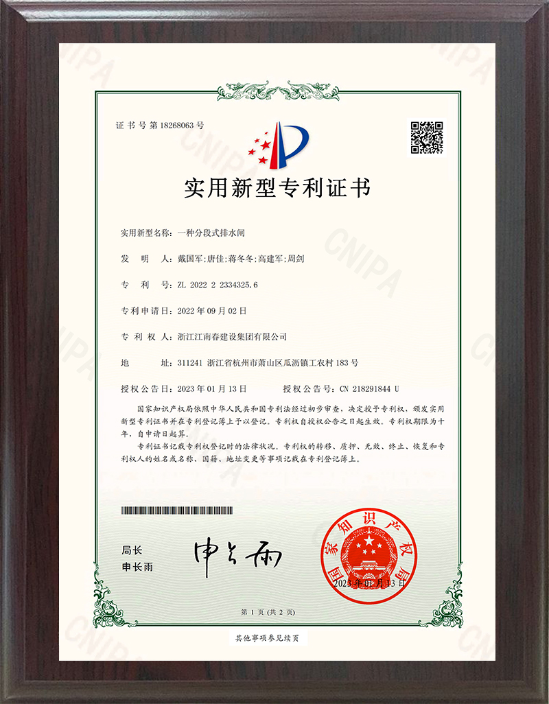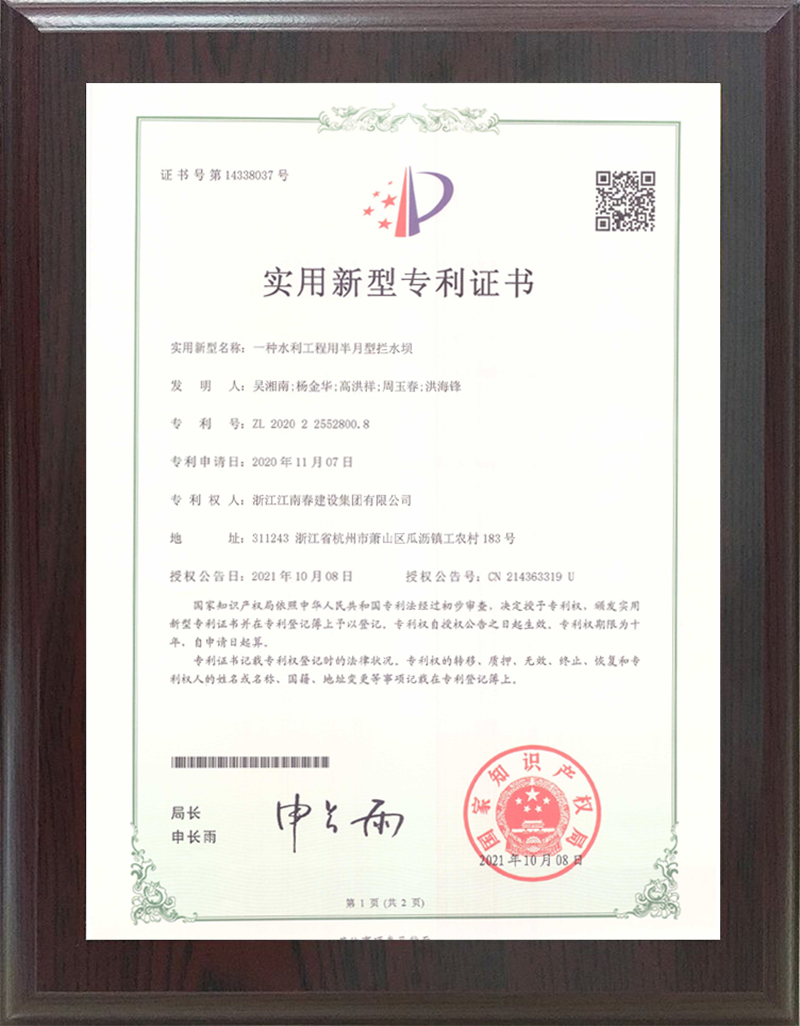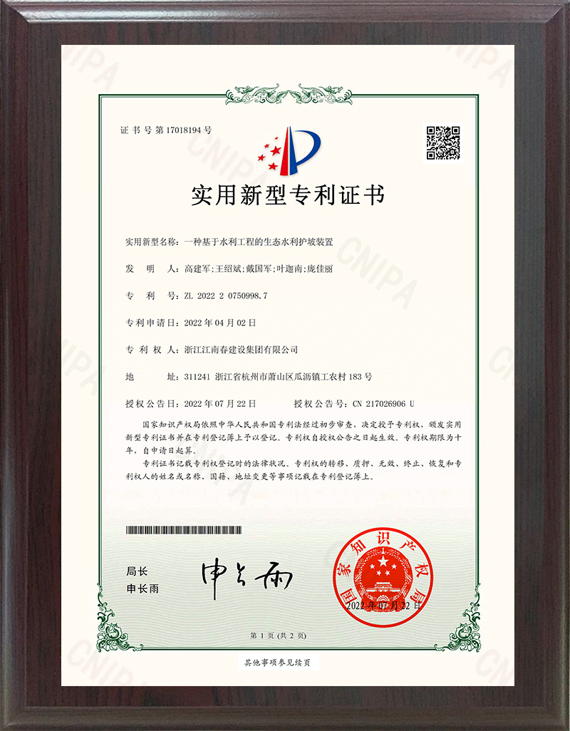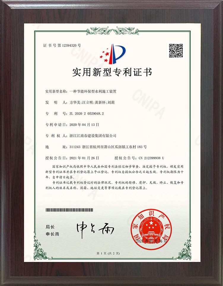實(shí)用新型專利證書(一種節(jié)能環(huán)保型水利施工裝置)